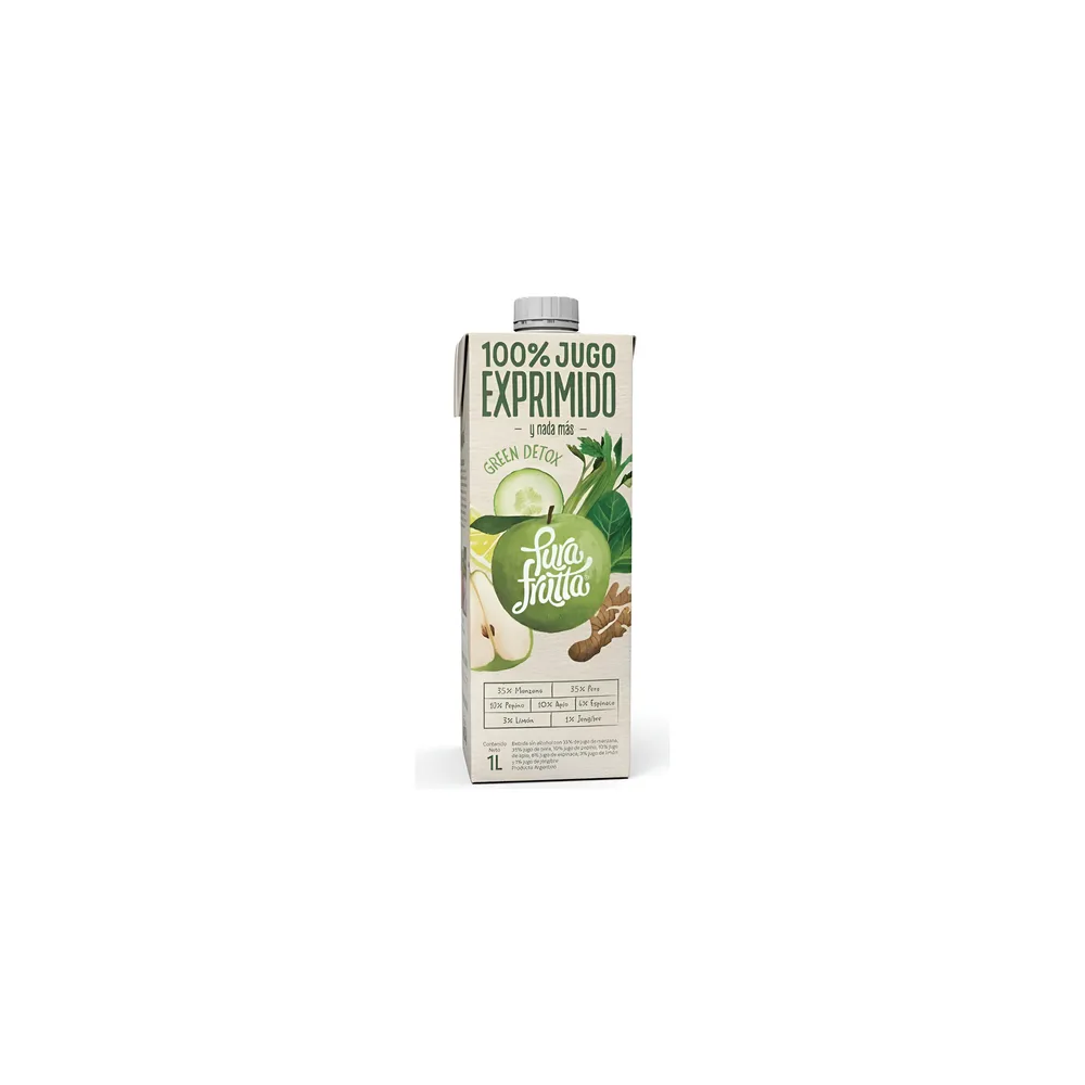 El jugo Green Detox de "Pura Frutta" es un jugo 100% exprimido que combina frutas y vegetales seleccionados por sus propiedades detox y nutricionales.